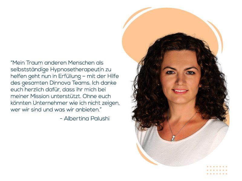Als Hypnosetherapeutin und HypnoBirthing Kursleiterin möchte Albertina Palushi ihre Kunden dabei unterstützen, ihr volles Potenzial auszuschöpfen, Ängste loszulassen, und Ereignisse wie die Geburt des eigenen Kindes positiver zu erleben und zu gestalten.